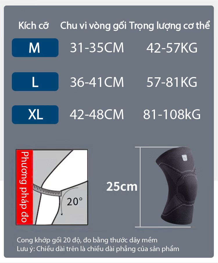 – Size XL: Chu vi vòng gối 42-48cm, trọng lượng cơ thể 81-108kg