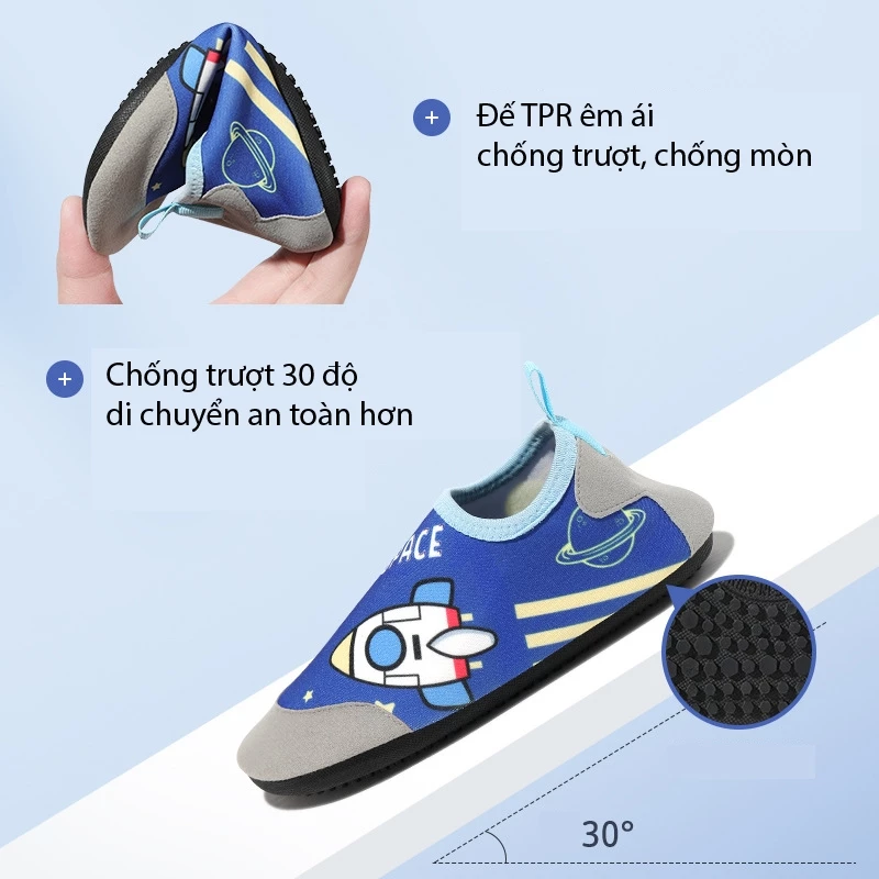 – Đế giày chống trơn trượt, bảo vệ bàn chân bé khi đi biển, đi bơi, chạy bộ, giúp trẻ thoải mái trong mọi hoạt động trên biển